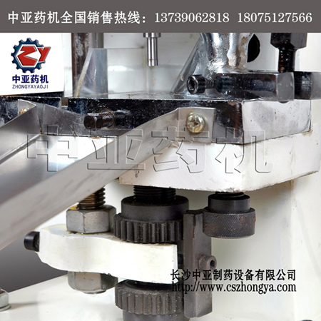 單沖壓片機(jī)的主件為流線型機(jī)身,整體鑄造而成,裝配精度高,材質(zhì)優(yōu)良耐磨損,穩(wěn)定可靠。其上有主軸串連著三個(gè)心形凸輪,軸的右端裝有飛輪,附有活動(dòng)手柄,可作手搖調(diào)整工作,軸的左端裝有從動(dòng)齒輪,有電機(jī),通過皮帶輪由三角帶傳動(dòng)到小齒輪至從動(dòng)齒輪,帶動(dòng)主軸。主要工作過程分為:A.充填;B.沖壓成型;C.出片。三道程序連續(xù)進(jìn)行,其每道程序均可調(diào)節(jié),適合各種元件及片劑的制造需求。
