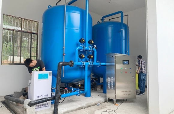 工藝流程:山泉水-絮凝投加器-石英砂過濾器-二氧化氯加藥器-用水點(diǎn)