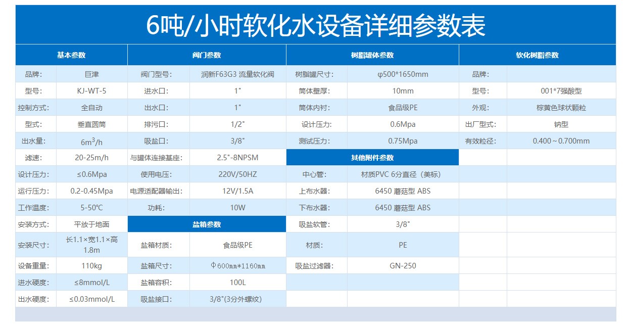 6T/H(每小時出水 1噸) 全自動軟化水設備,設備基本上每天處理量40噸水左右,本軟化水設備采用數字顯示全自動閥門,按流量進行再生,具有自動化程度高,鹽耗低等特點,是鍋爐水軟化、空調冷卻水、化工用水、賓館、洗衣房、生活用水、紡織行業(yè)、軟化水選用設備。一、設備三維效果圖二、設備常用參數......