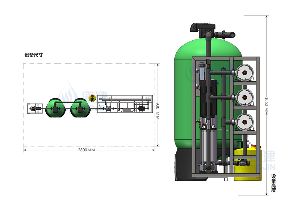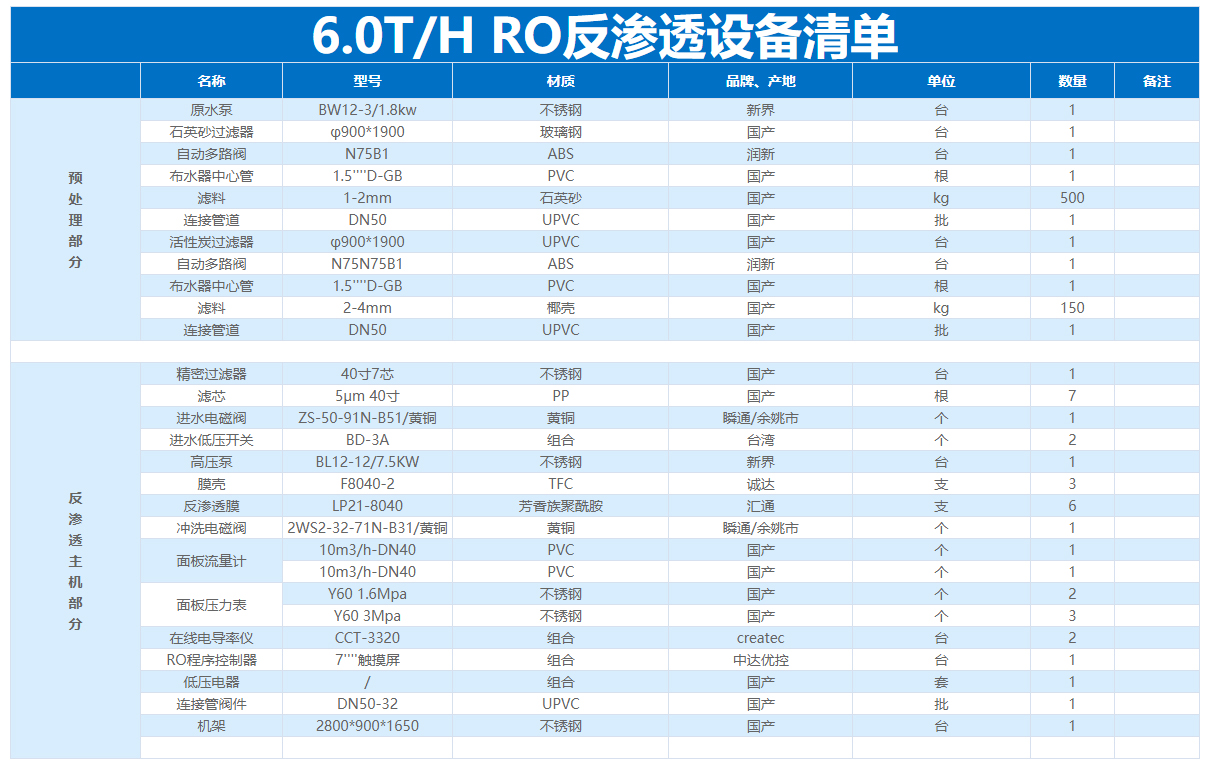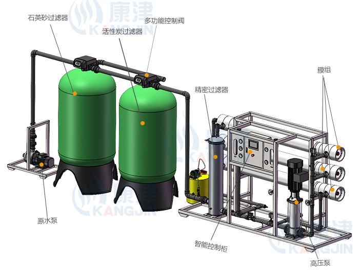 為保證關(guān)鍵設(shè)備,如:單反滲透裝置的長期可靠穩(wěn)定運(yùn)行,設(shè)置預(yù)處理系統(tǒng),滿足反滲透膜(RO)進(jìn)水指標(biāo):濁度<0.5NTU、SDI<4、余氯<0.1ppm。根據(jù)原水水質(zhì),預(yù)處理系統(tǒng)由原水水箱、原水泵、多介質(zhì)過濾器、活性炭過濾器、軟化過濾器、保安過濾及相關(guān)輔助設(shè)備組成。